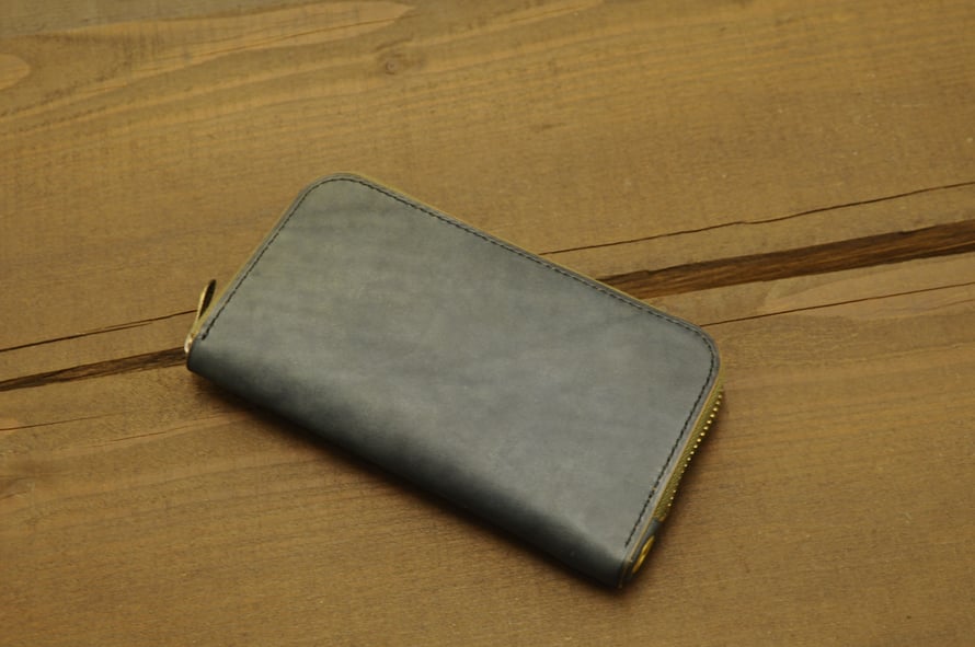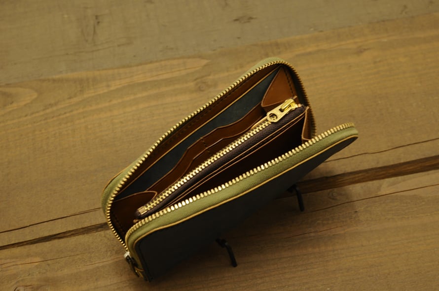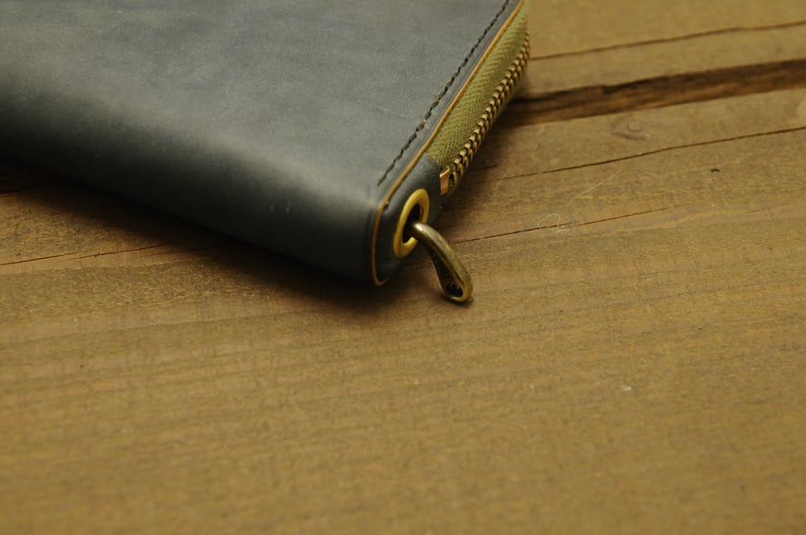 06日 7月 2018 KUBIKI ROUND ZIP L/W (custom order) order work ☆KUBIKI ROUND ZIP LONG WALLET LEATHER outside:KUBIKINDIGO(Italian Leather) inside : camel/KUBIKINDIGO(Italian Leather) stitch : black/gold Zip khaki/gold (board slider) with KUBIKI WALLET T-BAR tagPlaceholderカテゴリ: wallet, longwallet