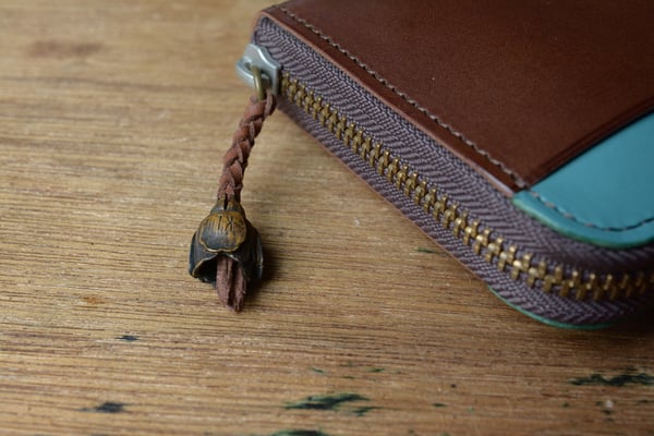 外側のファスナーの引手にはオリジナルで製作した真鍮製のチューリップスライダー。